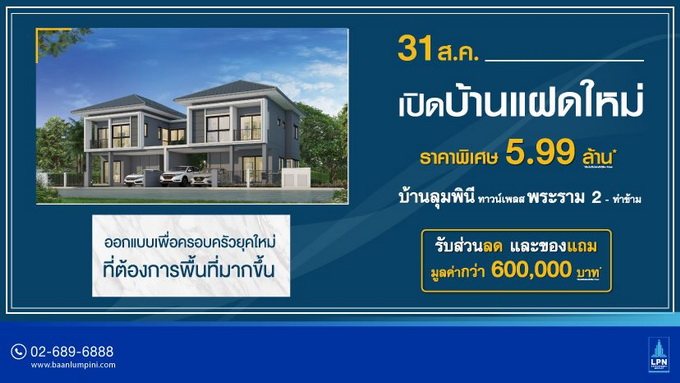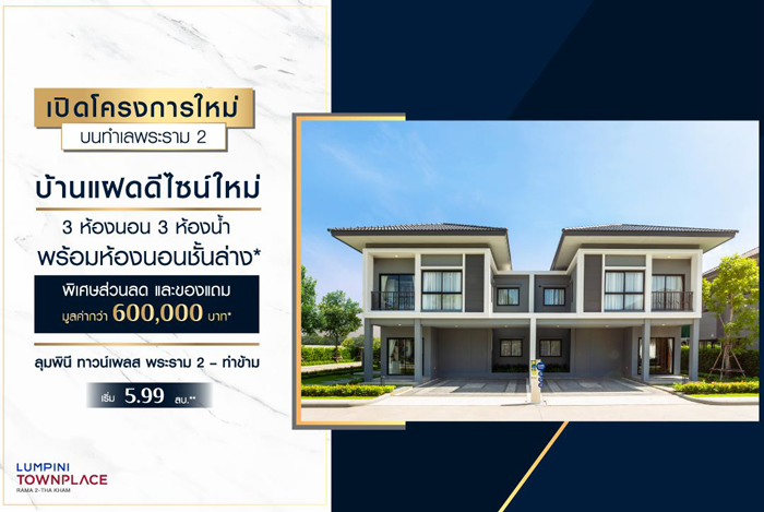 LPN เจาะทำเลทองย่านพระราม 2 ลุยแนวราบเต็มสูบ เปิดตัวบ้านแฝดน้องใหม่ "บ้านลุมพินี ทาวน์เพลส พระราม 2 - ท่าข้าม" โครงการส่วนต่อขยาย (Expand Project) แห่งที่ 2 หลังยอดขายไปได้สวยกว่า 80% ดีไซน์ทุกพื้นที่พอดีอย่างลงตัว ครบทุกฟังก์ชันการใช้งาน กว้างกว่าเดิมด้วยพื้นที่ใช้สอย 154.90 ตร.ม. กับ 3 ห้องนอน 3 ห้องน้ำ รองรับครอบครัวขยายยุคใหม่ มีความเป็นส่วนตัวสูงเพียง 108 ยูนิต ภายใต้การบริหารหลังการขายกลยุทธ์ "ชุมชนน่าอยู่" ส่วนกลางเพียบพร้อมด้วยคลับเฮ้าส์และสโมสรเพื่อสุขภาพ หรูหราอย่างมีระดับภายใต้คอนเซ็ปต์ "Homey Elegant" สถาปัตยกรรมยุค "Mid Century Modern" ที่นำเส้นสายรูปทรงเรขาคณิตมาออกแบบอย่างลงตัว ด้าน Interior Design สไตล์ Modern Farmhouse และ Art Deco ทำเลติดถนนใหญ่ ถนนท่าข้าม เชื่อมต่อเข้า-ออกเมืองง่ายดาย ใกล้ห้างสรรพสินค้าชั้นนำ อาทิ เซ็นทรัล, บิ๊กซี, โลตัส พระราม 2 พิเศษราคาเริ่มต้น 5.99 ล้านบาท Grand Opening เสาร์ที่ 31 สิงหาคม 2562 นี้ เฉพาะวันงานรับส่วนลดและของแถมกว่า 600,000 บาท