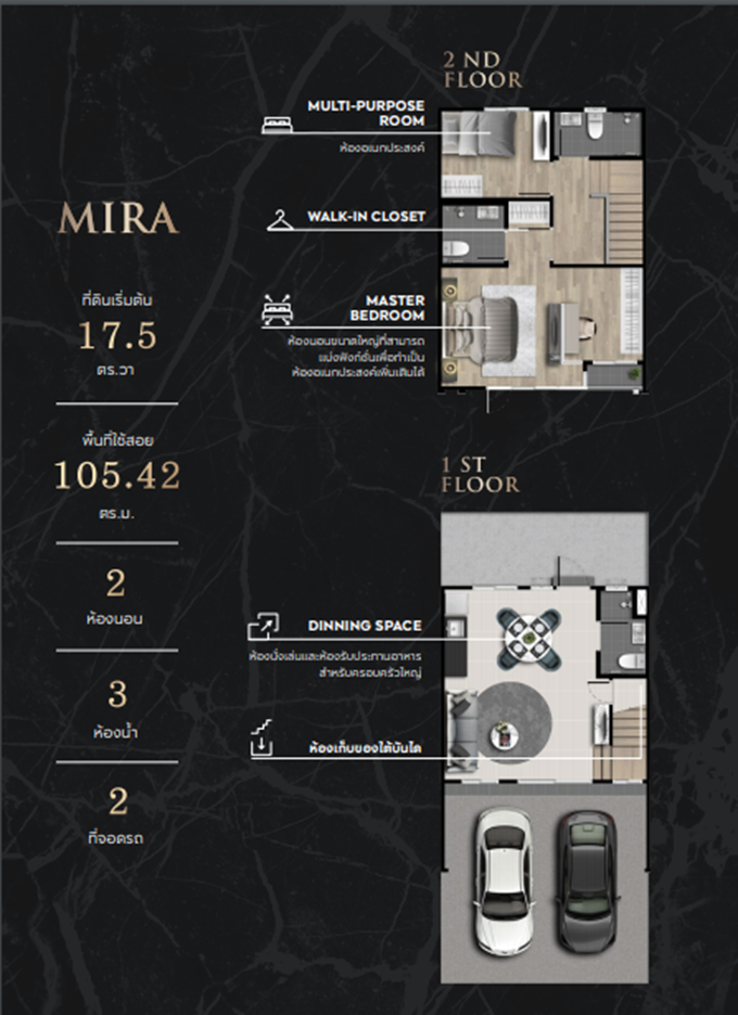 - MIRA ทาวน์โฮม 2 ชั้น พื้นที่ใช้สอย 105.42 ตร.ม. หน้ากว้าง 5.5 เมตร 2 ห้องนอน 3 ห้องน้ำ 2 ที่จอดรถ ที่ดินเริ่มต้น 17.5 ตร.ว.