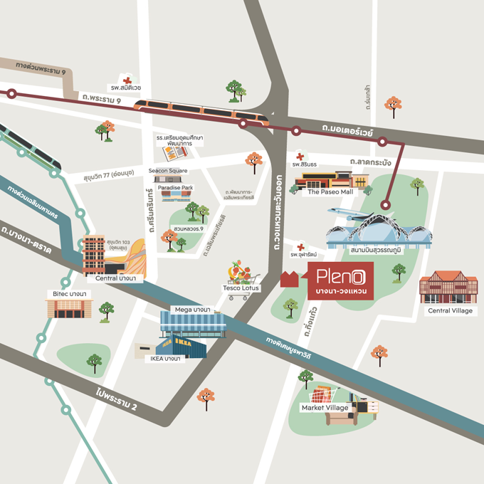 "พลีโน่ บางนา - วงแหวน (Pleno Bangna - Wongwaen)" โครงการตั้งอยู่ติดถนนคู่ขนานกาญจนาภิเษก เขตตำบลบางพลีใหญ่ อำเภอบางพลี จังหวัดสมุทรปราการ เชื่อมต่อถนนหลากหลายเส้นทาง อาทิ ถนนบางนา, ถนนลาดกระบัง, ถนนกิ่งแก้ว เป็นต้น ใกล้ทางด่วนพระราม 9 - มอเตอร์เวย์ แอร์พอร์ตลิงก์ทับช้าง และสนามบินสุวรรณภูมิ
