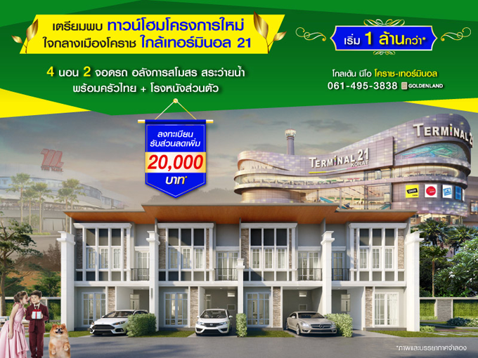 โกลเด้นแลนด์ เปิดให้จอง โกลเด้น นีโอ โคราช-เทอร์มินอล (Golden Neo Korat-Terminal) เตรียมพบ ทาวน์โฮมโครงการใหม่ ใจกลางโคราช ใกล้เทอร์มินอล 21 ทาวน์โฮมหรู สไตล์อิตาลี 4 ห้องนอน 2 ที่จอดรถ อลังการสโมสร สระว่ายน้ำ พร้อมครัวไทย+โรงหนังส่วนตัว บรรยากาศสวนสวยธรรมชาติรอบโครงการ ท่านที่สนใจสามารถลงทะเบียนเพื่อรับส่วนลดเพิ่ม 20,000 บาท* ได้ที่เว็บไซต์ของโกลเด้นแลนด์