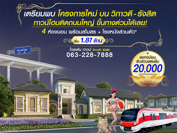 โกลเด้นแลนด์ เปิดให้จอง โกลเด้น ทาวน์ วิภาวดี-รังสิต (Golden Town Vibhavadi-Rangsit) เตรียมพบโครงการใหม่ ย่านวิภาวดี-รังสิต ทาวน์โฮมติดถนนใหญ่ ขึ้นทางด่วนได้เลย พบกับทาวน์โฮม 4 ห้องนอน พร้อมสโมสร สไตล์อังกฤษ + โรงหนังส่วนตัว* พร้อมสวนสวยรอบโครงการ ท่านที่สนใจสามารถลงทะเบียนจองออนไลน์เพื่อรับส่วนลดเพิ่ม 20,000 บาท* ได้ที่เว็บไซต์ของโกลเด้นแลนด์
