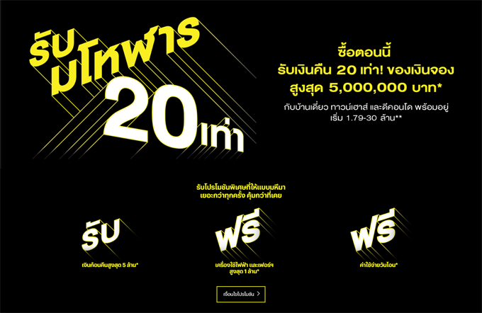 โปรโมชั่น: "รับมโหฬาร 20 เท่า" ซื้อตอนนี้ รับเงินคืน 20 เท่า! ของเงินจอง สูงสุด 5,000,000 บาท* กับบ้านเดี่ยว ทาวน์เฮาส์ และดีคอนโด พร้อมอยู่ เริ่ม 1.79 - 30 ล้านบาท** รับโปรโมชั่นพิเศษที่ให้แบบมหึมา เยอะกว่าทุกครั้ง คุ้มกว่าที่เคย