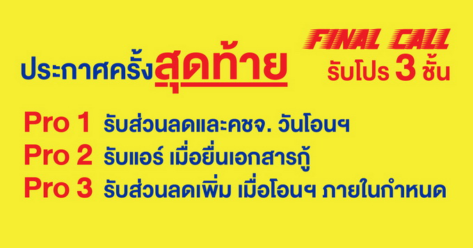 โปรโมชั่น: ประกาศครั้งสุดท้าย "Final Call รับโปรฯ 3 ชั้น" (คลิกดูโครงการที่เข้าร่วม)