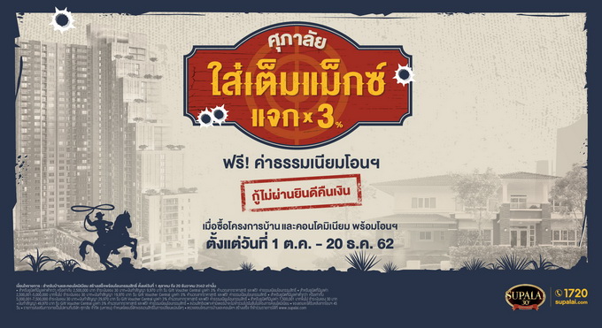 โปรโมชั่น: ศุภาลัย ใส่เต็มแม็กซ์ แจก x 3% ฟรี! ค่าธรรมเนียมโอนฯ กู้ไม่ผ่านยินดีคืนเงิน เมื่อซื้อโครงการบ้าน และคอนโดมิเนียม พร้อมโอนฯ ตั้งแต่วันที่ 1 ตุลาคม - 20 ธันวาคม 2562 ดูโครงการที่เข้าร่วมที่นี่