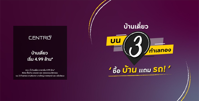 โปรโมชั่น: โปรฯ แจกรถ กับ บ้านเดี่ยวแบรนด์ เซนโทร 3 โครงการ เริ่ม 4.99 ล้านบาท* ตุลาคม 2562 นี้ พิเศษ! ซื้อบ้านแถมรถ และ ของแถมนวัตกรรม บน 3 ทำเลทอง รามอินทรา บางใหญ่ ราชพฤกษ์ และ แจ้งวัฒนะ ดูโครงการที่เข้าร่วมที่นี่