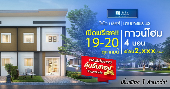 โปรโมชั่น: "ไลโอ บลิสซ์ มาบยางพร 43" เปิดพรีเซล!! 19-20 ตุลาคม นี้ ทาวน์โฮม 4 นอน จองในวันงาน* ลุ้นรับทอง จำนวนจำกัด ผ่อน 2,xxx /เดือน* เพียง 1 ล้านกว่า* ลงทะเบียนรับสิทธิพิเศษได้แล้ววันนี้