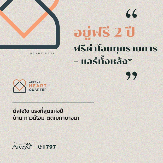 โปรโมชั่น: ดีลใจใจ อยู่ฟรี 2 ปี ! ฟรีค่าโอนทุกรายการ + แอร์ทั้งหลัง! โปรฯ เยอะที่สุดแห่งปีจากอารียา พร้อมให้คุณใช้ชีวิตบนทำเล "หัวใจ" บางนา โครงการที่เข้าร่วมได้แก่ ทาวน์โฮม เดอะ คัลเลอร์ส บางนา - วงแหวนฯ เริ่ม 2.59 ล้าน* บ้าน เดอะ วิลเลจ บางนา - วงแหวนฯ 3 เริ่ม 3.99 ล้าน* บ้านเดี่ยว อารียา โคโม่ พรีโม่ บางนา - วงแหวนฯ เริ่ม 6.69 ล้าน* รายละเอียดเพิ่มเติมที่นี่