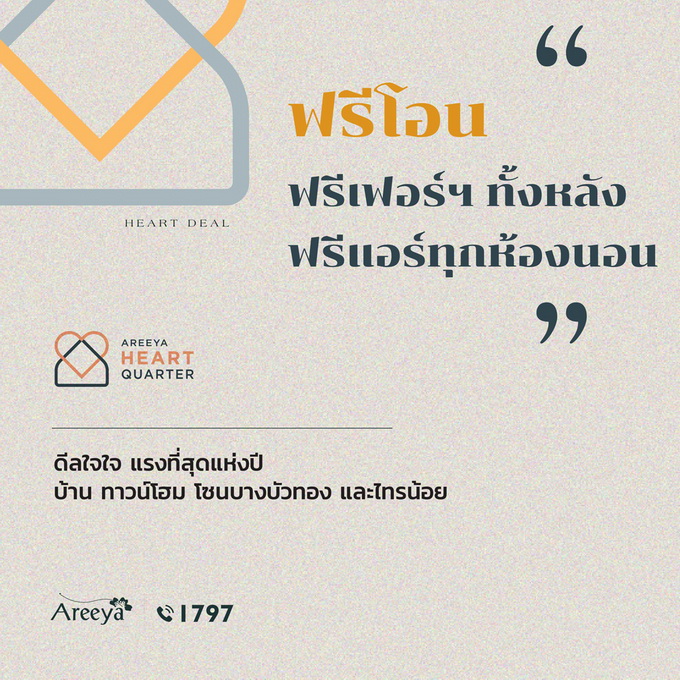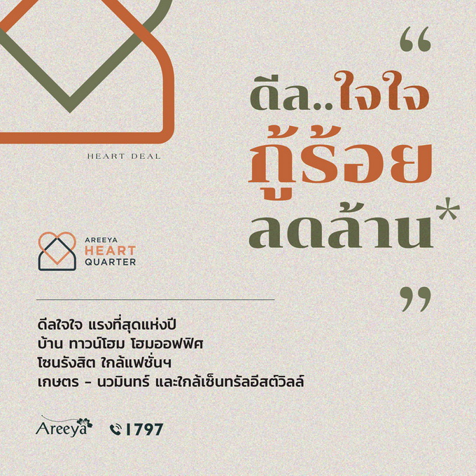 โปรโมชั่น: ดีลใจใจ จากอารียา กู้ร้อย ลดล้าน* พรีเมียมทาวน์โฮม โฮมออฟฟิศ ทำเลใจกลางเมือง ใกล้เซ็นทรัลอีสต์วิลล์ และ เกษตร-นวมินทร์ เริ่ม 6.29 - 11.9 ล้าน* บ้าน ทาวน์โฮม โซนรังสิต และใกล้แฟชั่นฯ จองเริ่มเพียง 999 บาท* ผ่อนถูกกว่าเช่า เริ่มเพียง 3,000 บาทต่อเดือน *พร้อมของแถม *ฟรีค่าโอน แอร์ และอื่นๆ อีกมากมาย เริ่ม 1.89 - 4.29 ล้าน* ดูรายละเอียดโครงการที่เข้าร่วมที่นี่