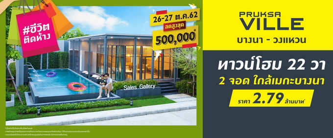 โปรโมชั่น: "พฤกษาวิลล์ 76 บางนา - วงแหวน" ทาวน์โฮม 22 ตร.ว. 2 ที่จอดรถ ใกล้เมกาบางนา เริ่ม 2.79 ล้านบาท* วันที่ 26 - 27 ตุลาคม 2562 นี้ ลดสูงุสด 500,000 บาท*