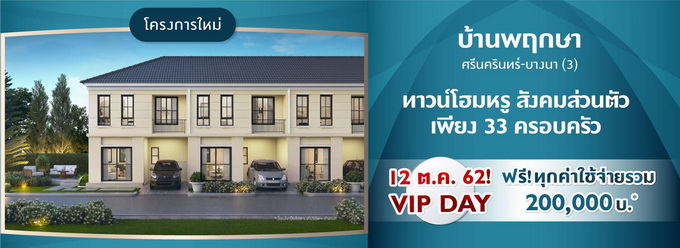 โปรโมชั่น: บ้านพฤกษา ศรีนครินทร์ - บางนา (3) โครงการใหม่ ทาวน์โฮมหรู สังคมส่วนตัวเพียง 33 ครอบครัว ใกล้รถไฟฟ้า 2 สถานี* 12 ตุลาคม 2562 นี้ VIP DAT รับฟรี! Gift Voucher 20,000 บาท* ลงทะเบียนที่นี่