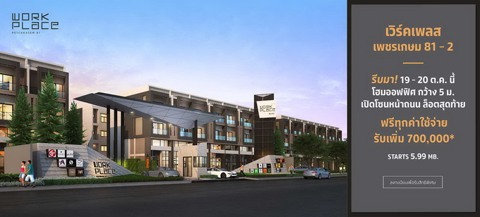 โปรโมชั่น: "เวิร์คเพลส เพชรเกษม 81-2" รีบมา! 19 - 20 ตุลาคม 2562 นี้ โฮมออฟฟิศหน้ากว้าง 5 เมตร เปิดโซนหน้าถนน ล็อตสุดท้าย ฟรี! ทุกค่าใช้จ่าย รับเพิ่ม 700,000 บาท* เริ่ม 5.99 ล้านบาท ลงทะเบียนเพื่อรับสิทธิพิเศษที่นี่
