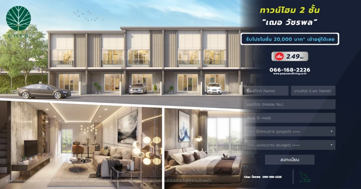 บริษัท พีซแอนด์ลีฟวิ่ง จำกัด จัดโปรโมชั่นสุดพิเศษกับโครงการ "เฌอ วัชรพล (Cher Watcharapol)" ทาวน์โฮม 2 ชั้น เพียง 10 นาทีถึงทางด่วน สัมผัสชีวิตส่วนตัวและการพักผ่อนไปกับธรรมชาติ ด้วยสวนสวยขนาดใหญ่ พร้อมอุ่นใจกับระบบรักษาความปลอดภัยตลอด 24 ชม. มาก่อน ได้ก่อน ไม่ต้องจับฉลาก จอง 5,000 บาท* ฟรีค่าใช้จ่ายวันโอน*