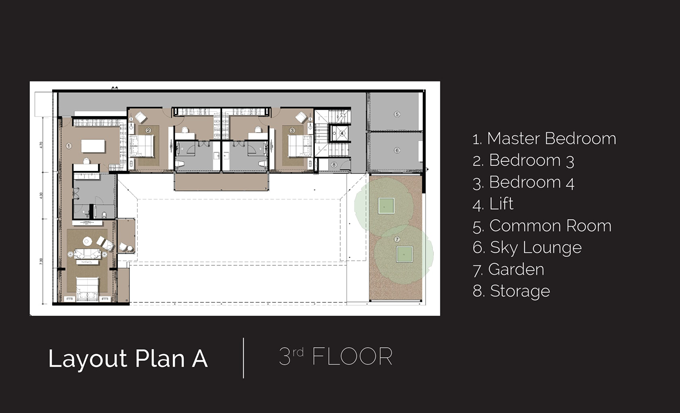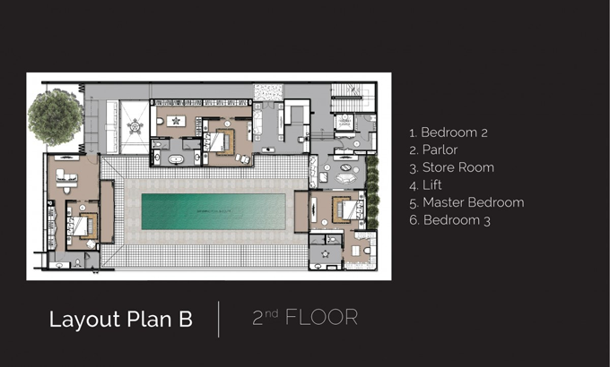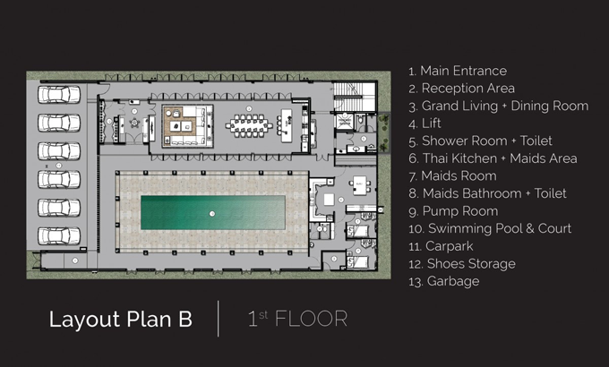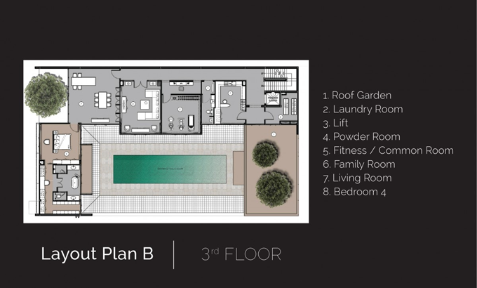 บ้านเดี่ยว 3 ชั้น มีเพียง 8 หลัง แต่ละหลัง มีพื้นที่ 182 ตารางวา และพื้นที่ใช้สอยภายในบ้านประมาณ 1,150 ตารางเมตร มีห้องนั่งเล่น ห้องรับแขก ห้องรับประทานอาหาร บาร์ เพื่อการพักผ่อนและสังสรรค์ ห้องนอนทั้ง 5 ห้อง พร้อม walk-in closet ห้องออกกำลังกายและสปา ห้องซักรีด ห้องแม่บ้าน สวนหย่อม และสระว่ายน้ำส่วนตัว จอดรถได้ 6 คัน