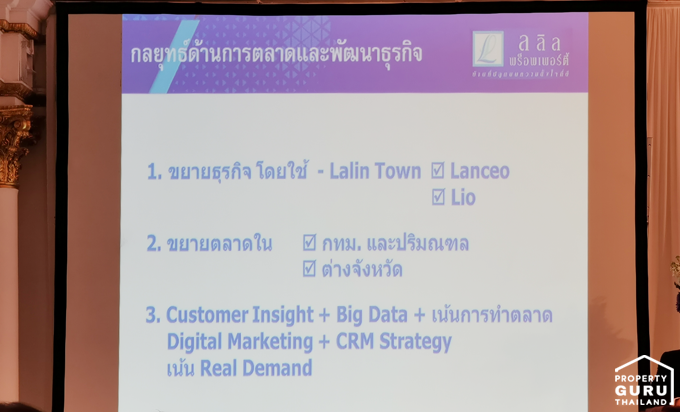นายชูรัชฏ์ ชาครกุล กรรมการรองผู้จัดการใหญ่ บริษัท ลลิล พร็อพเพอร์ตี้ จำกัด (มหาชน) (LALIN) (Mr. Churat Chakarakul, Deputy Managing Director, Lalin Plc.) กล่าวถึง แผนงานด้านการตลาดว่า ในปีนี้ ลลิล พร็อพเพอร์ตี้ จะดำเนินธุรกิจเชิงรุก แสดงศักยภาพขององค์กรต้นแบบผู้พัฒนาโครงการอสังหาริมทรัพย์อย่างยั่งยืน มากกว่า 30 ปี รวมถึงการสร้างศักยภาพองค์กรให้เติบโตในตลาดอสังหาริมทรัพย์อย่างมั่นคง ขึ้นเป็น National Housing Company โดยเมื่อกล่าวถึง ที่อยู่อาศัยแนวราบราคาตั้งแต่ 2 - 6 ล้านบาท แบรนด์ลลิล จะต้องเป็น Top of Mind ใน 3 ลำดับแรกของผู้บริโภค