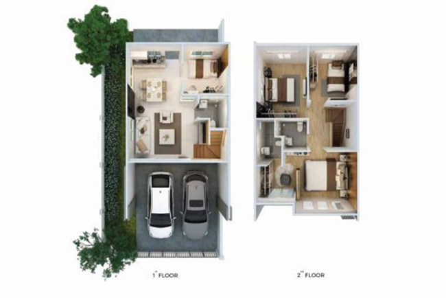 แบบบ้าน Blooming - ทาวน์โฮม 2 ชั้น หน้ากว้าง 5.7 เมตร ขนาดที่ดิน 21.4 ตร.ว. พื้นที่ใช้สอย 140 ตร.ม. ขนาด 4 ห้องนอน 3 ห้องน้ำ 2 ที่จอดรถ
