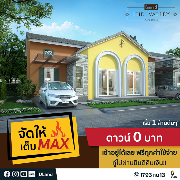 ดี - แลนด์ จัดโปรโมชั่นต้อนรับปีใหม่ กับโปรฯ "จัดให้เต็ม MAX!" สำหรับคนอยากมีบ้านใกล้แหล่งงานย่าน EEC ทำเลใจกลางเมืองปลวกแดง สามารถเชื่อมสู่ตัวเมืองศรีราชา - ชลบุรีได้อย่างสะดวกสบาย กับโครงการ บ้านดีเดอะวัลเล่ย์ ในราคาเริ่มเพียง 1 ล้านต้นๆ พร้อมเข้าอยู่ได้เลย แถมฟรีทุกค่าใช้จ่าย และของแถมอีกมากมาย