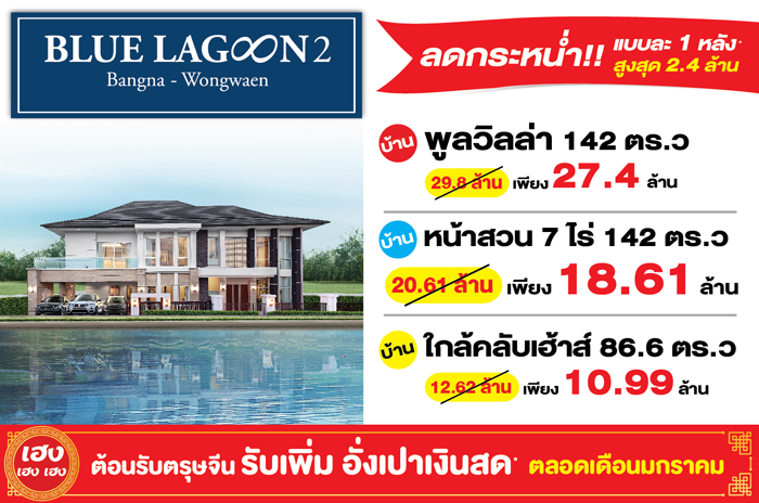 บลูลากูน 2 ลดกระหน่ำ แบบละ 1 หลัง สูงสุด 2.4 ลบ. พร้อมแจกอั่งเปาเพิ่ม ต้อนรับเทศกาลตรุษจีน
