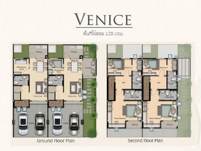 1. Venice ทาวน์โฮม 2 ชั้น พื้นที่ใช้สอย 120 ตร.ม. ประกอบไปด้วย 3 ห้องนอน 3 ห้องน้ำ 1 ห้องรับรอง ครัวไทยแยกส่วน และ 2 ที่จอดรถ