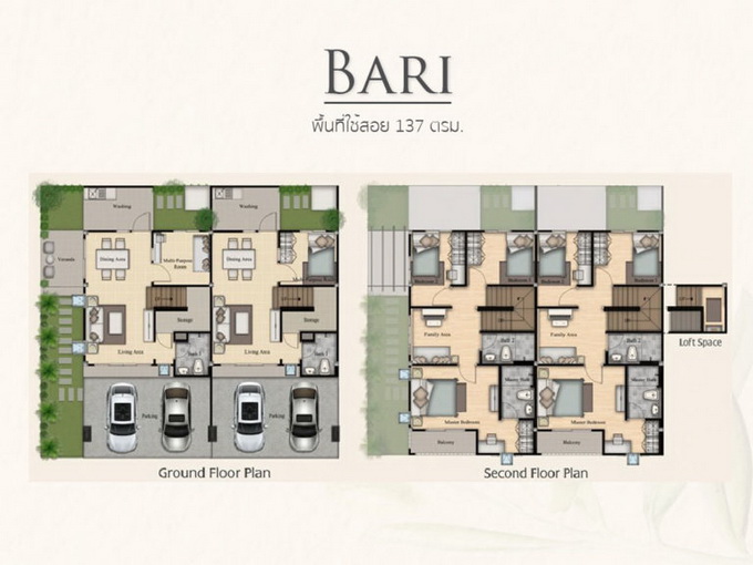 2. Bari ทาวน์โฮม 2 ชั้น พื้นที่ใช้สอย 137 ตร.ม. ประกอบไปด้วย 4 ห้องนอน 3 ห้องน้ำ 1 ห้องรับรอง ครัวไทยแยกส่วน Loft Space และ 2 ที่จอดรถ