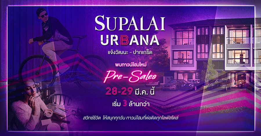 บริษัท ศุภาลัย จำกัด (มหาชน) เตรียมเปิดจองโครงการใหม่ "ศุภาลัย เออร์บานา แจ้งวัฒนะ - ปากเกร็ด (Supalai Urbana Chaengwattana - Pakkred)" ทาวน์โฮม 3 ชั้น มาพร้อมแนวคิด ชีวิตในเมือง เปลี่ยนความเร่งรีบ เป็นความสนุกสนาน เปลี่ยนที่อยู่อาศัยแบบเดิมๆ สู่ความท้าทายใหม่ๆ ด้วยทาวน์โฮมดีไซน์ใหม่ ที่ออกแบบและสามารถเปลี่ยนพื้นที่อเนกประสงค์ ได้ตามไลฟ์สไตล์ เตรียมเปิดจองวันที่ 28 - 29 มีนาคม 2563 นี้