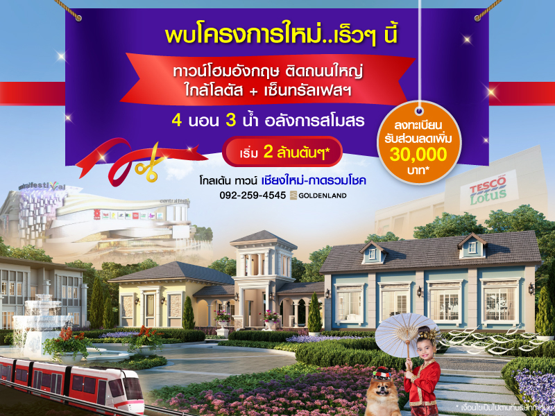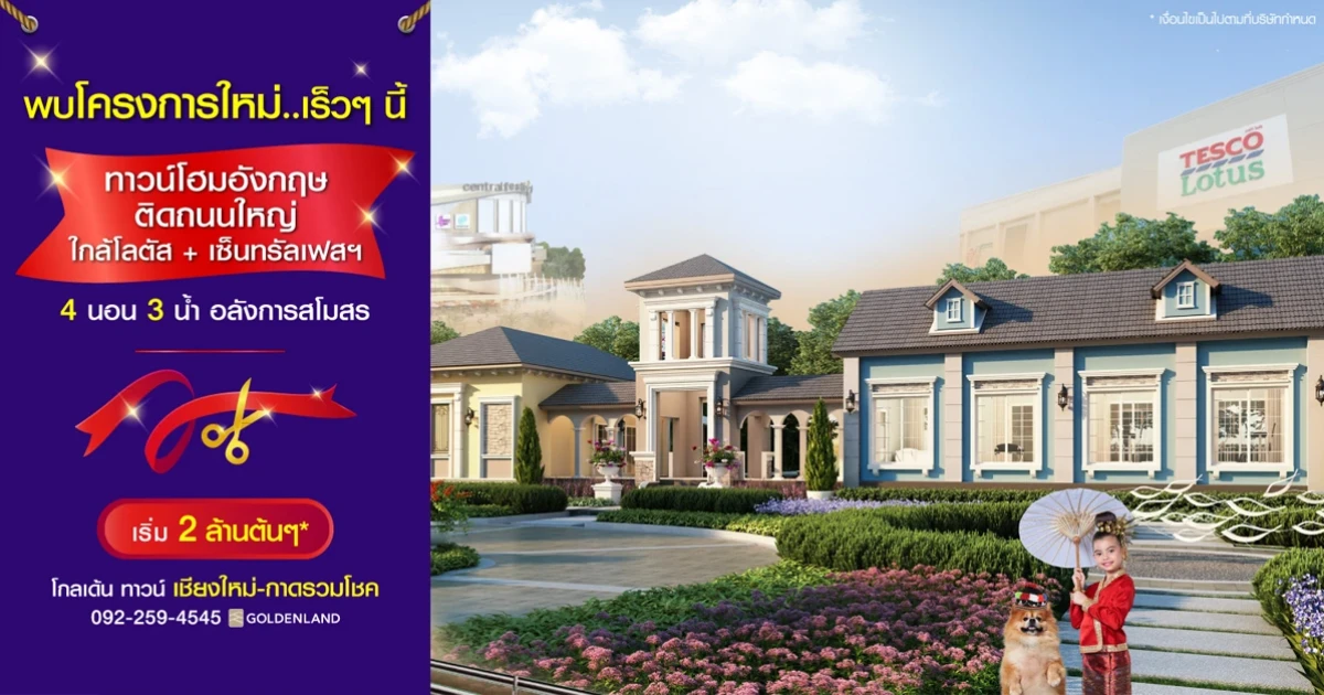 โกลเด้นแลนด์ เปิดให้จอง โกลเด้น ทาวน์ เชียงใหม่-กาดรวมโชค (Golden Town Chiangmai - Ruamchok Market) พบโครงการใหม่ เร็วๆ นี้ ทาวน์โฮมสไตล์อังกฤษ ติดถนนใหญ่ ใกล้โลตัส+เซ็นทรัลเฟสติวัล พบกับทาวน์โฮม 4 ห้องนอน 3 ห้องน้ำ สไตล์อังกฤษ อลังการสโมสรภายในโครงการ ท่านที่สนใจสามารถลงทะเบียนจองออนไลน์เพื่อรับส่วนลดเพิ่ม 30,000 บาท* ได้ที่เว็บไซต์ของโกลเด้นแลนด์
