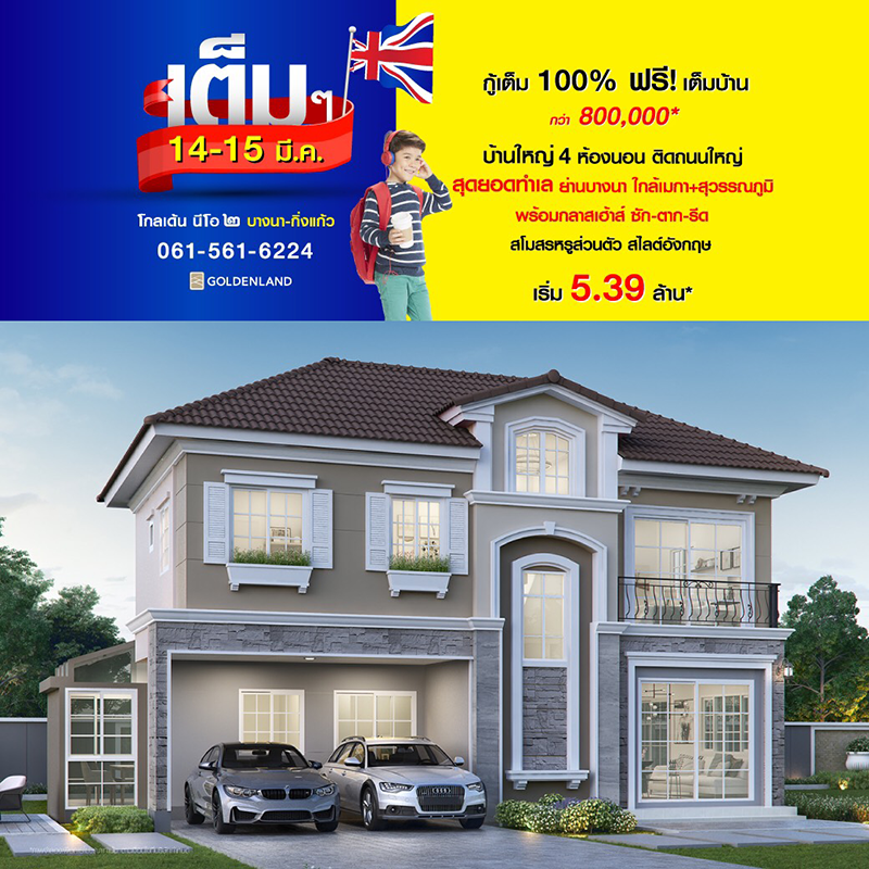 Promotion : 14-15 มี.ค. กู้เต็ม 100 ฟรี! เต็มบ้าน กว่า 800,000 บาท* บ้านใหญ่ 4 ห้องนอน ติดถนนใหญ่ ย่านบางนา เพียง 5 นาที ถึงสนามบินสุวรรณภูมิ ใกล้เมกะ พร้อมห้องกลาสเฮ้าส์ ซัก ตาก รีด และสโมสรหรู ส่วนตัว เริ่ม 5.39 ล้าน*
