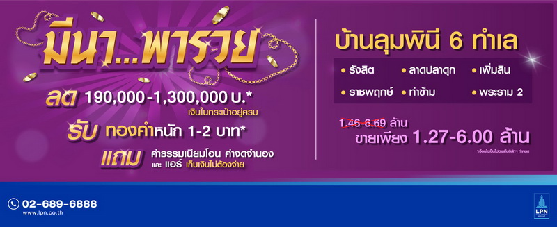 โปรโมชั่น: มีนา พารวย บ้านลุมพินี 6 ทำเล ลด 190,000 - 1,300,000 บาท* รับ ทองคำหนัก 1-2 บาท แถม ค่าธรรมเนียมโอน ค่าจดจำนอง และ แอร์ ขายเพียง 1.27 - 6 ล้านบาท ดูโครงการที่เข้าร่วมที่นี่