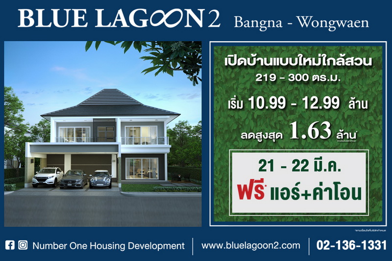 โปรโมชั่น: 21-22 มีนาคม 2563 นี้ BLUE LAGOON 2 เปิดสัมผัสบ้านหรูแบบใหม่ ใกล้สวน Infinity park 7 ไร่เพียง 10.99 - 12.99 ล้านบาท ฟรีแอร์+ค่าโอน