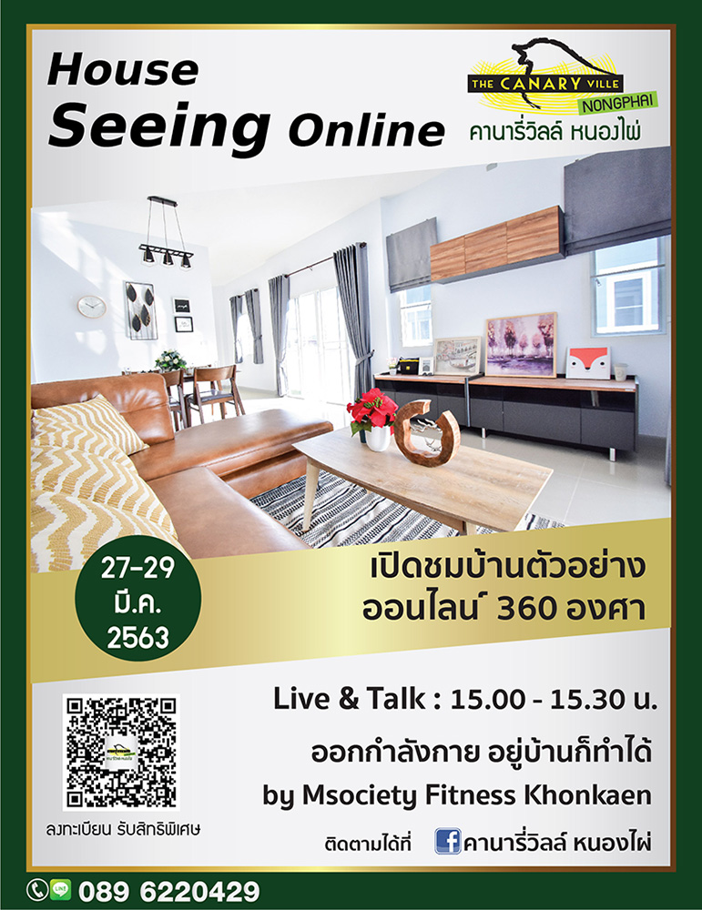บริษัท อีสานพิมานกรุ๊ป จำกัด เปิดประสบการณ์ใหม่ของการเยี่ยมชมบ้าน เปิดบ้านออนไลน์ 360 องศา ของโครงการ "คานารี่วิลล์ หนองไผ่ (Canary Ville Nongphai)" บ้านเดี่ยว 1 - 2 ชั้น บนทำเลเมืองขอนแก่น ใกล้มหาวิทยาลัยขอนแก่น พร้อมทั้งกิจกรรมพิเศษ Live & Talk ในช่วงเวลา 15.00 - 15.30 น. ออกกำลังกาย อยู่บ้านก็ทำได้ by Msociety Fitness Khonkaen วันที่ 27 - 29 มีนาคม 2563 นี้ ติดตามได้ทาง Facebook หมู่บ้านคานารี่วิลล์ หนองไผ่