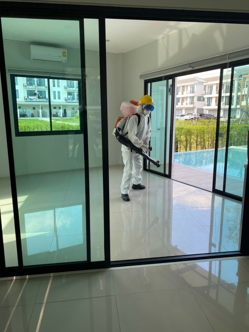8. ฉีดพ่นยาฆ่าเชื้อที่สำนักงานใหญ่และสำนักงานขาย บ้านตัวอย่างทุกโครงการ
