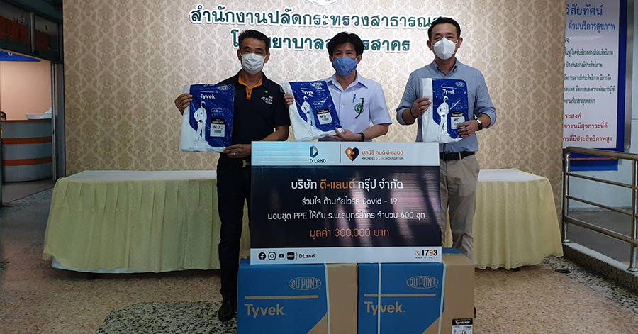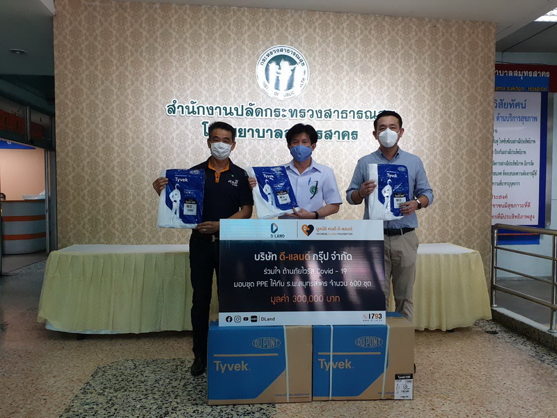 นอกจากนี้ ดี - แลนด์ ยังได้ห่วงใย ใส่ใจสังคม ร่วมใจ ต้านภัยไวรัส Covid-19 โดยการมอบอุปกรณ์ป้องกันภัยส่วนบุคคล (Personal Protective Equipment : PPE) จำนวน 600 ชุด ให้แก่บุคลากรด้านการแพทย์ โรงพยาบาลสมุทรสาคร เพื่อลดความเสี่ยงในการสัมผัสเชื้อโรค และเพิ่มความปลอดภัยในการปฏิบัติงานของเจ้าหน้าที่ โดยมี นายแพทย์อนุกูล ไทยถานันดร์ ผู้อำนวยการโรงพยาบาลสมุทรสาคร ให้เกียรติเป็นผู้รับมอบ