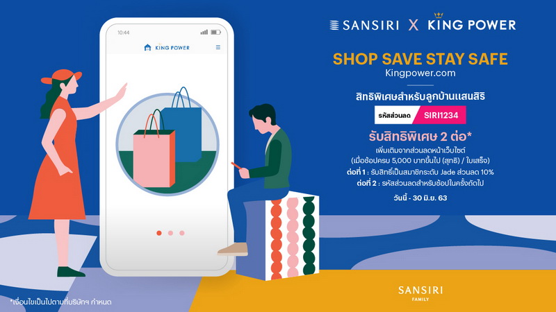 นำเสนอประสบการณ์ช้อปปิ้งออนไลน์ผ่าน www.kingpower.com และแอปพลิเคชัน KING POWER กับแคมเปญ "SHOP SAVE STAY SAFE" ช้อปที่บ้าน มีแต่ Save กับ Safe พร้อมมอบสิทธิพิเศษสุดคุ้มเฉพาะครอบครัวแสนสิริในช่วง Work From Home รับสิทธิพิเศษ 2 ต่อ* เมื่อช้อปครบ 5,000 บาทขึ้นไป (สุทธิ) ต่อใบเสร็จ เพียงใส่รหัส code "SIRI1234"