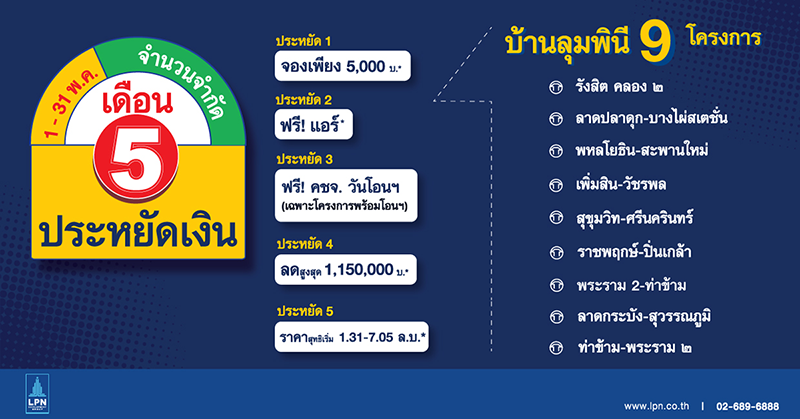 บริษัท แอล.พี.เอ็น.ดีเวลลอปเมนท์ จำกัด (มหาชน) (LPN) จัดโปรโมชั่น เดือน 5 ประหยัดเงิน กับ 5 โปรโมชั่นพิเศษ กับบ้านลุมพินี 9 โครงการ