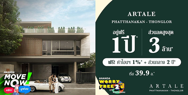 อาร์เทล พัฒนาการ-ทองหล่อ Ananda Worry Free (สูงสุด) 2 ปี ดีลดีแน่นอน อยู่ฟรี 1 ปี ส่วนลดสูงสุด 3 ล้าน* ฟรี! ค่าโอน 1% + ส่วนกลาง 2 ปี* เริ่ม 39.9 ล้านบาท*