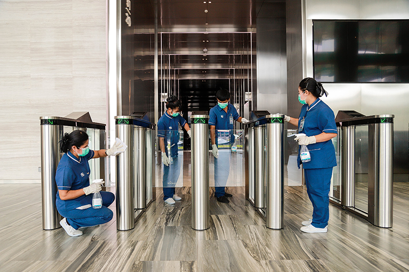 17. ใช้น้ำยาฆ่าเชื้อทำความสะอาดปุ่มกดลิฟต์ทุกชั่วโมง และสำหรับลิฟต์ที่มีการติดตั้งระบบ Destination control ยังช่วยลดการสัมผัส