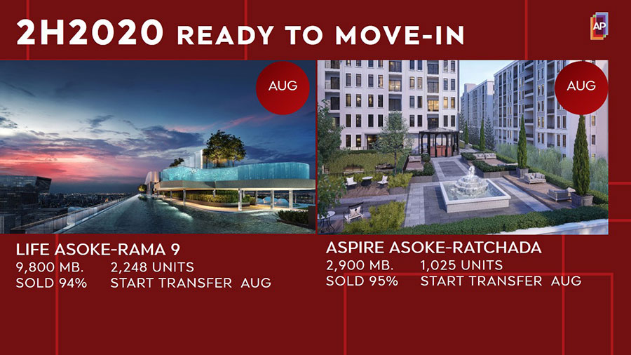 LIFE ลาดพร้าว มูลค่า 8,000 ล้านบาท และ ASPIRE สุขุมวิท-อ่อนนุช มูลค่า 1,600 ล้านบาท และเตรียมส่งมอบในครึ่งปีหลังอีก 2 โครงการ ได้แก่ LIFE อโศก-พระราม 9 มูลค่า 9,800 ล้านบาท และ ASPIRE อโศก-รัชดา มูลค่า 2,900 ล้านบาท