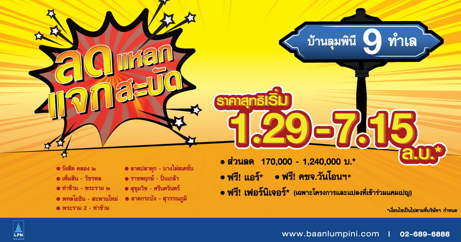 ลดแหลก แจกสะบัด บ้านลุมพินี 9 ทำเล ราคาสุทธิเริ่ม 1.29 - 7.15 ล้านบาท รับส่วนลด 170,000 - 1,240,000 บาท* ฟรี! แอร์ ฟรี! ค่าใช้จ่ายวันโอนฯ* ฟรี! เฟอร์นิเจอร์* (เฉพาะโครงการและแปลงที่เข้าร่วมแคมเปญ)