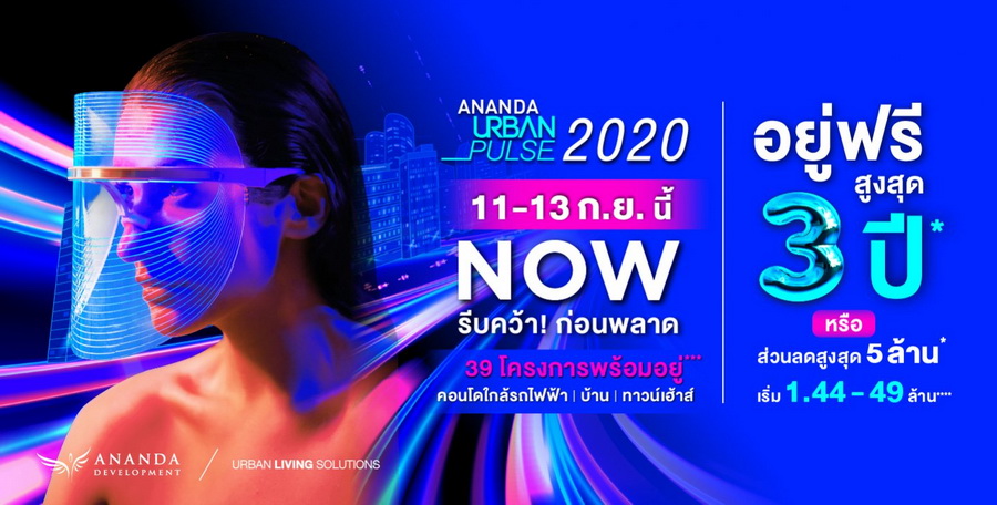 Ananda Urban Pulsa 2020 วันที่ 11 - 13 กันยายน 2563 นี้ Now รีบคว้า! ก่อนพลาด 39 โครงการพร้อมอยู่* คอนโดใกล้รถไฟฟ้า บ้าน ทาวน์เฮ้าส์ อยู่ฟรี สูงสุด 3 ปี* หรือ ส่วนลดสูงสุด 5 ล้านบาท* เริ่ม 1.44 - 49 ล้านบาท*