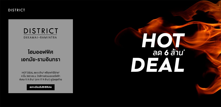 DISTRICT เอกมัย-รามอินทรา (รามอินทรา 40) HOT DEAL ลด 6 ล้าน* ฟรีทุกค่าใช้จ่าย* พิเศษ 11.9 ล้าน* (จาก 17.9 ล้าน*) ยูนิตสุดท้าย ลงทะเบียนพร้อม ADD LINE@ สำหรับโปรโมชั่นและสำรองสิทธิ* (สงวนสิทธิโปรโมชั่นให้ลูกค้าที่นัดหมายและจองก่อนเท่านั้น*)