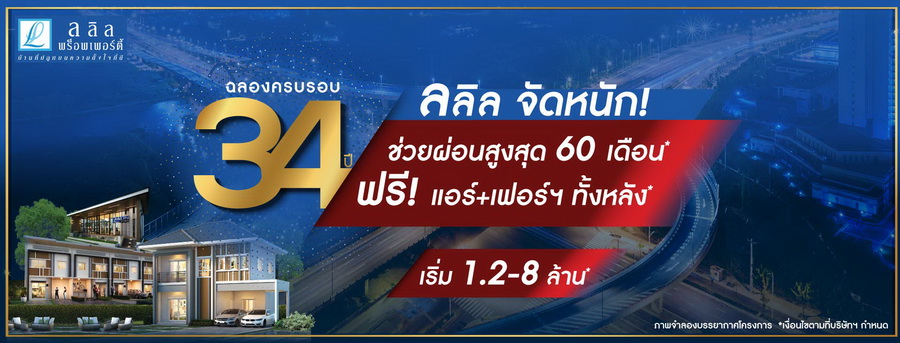 ฉลองครบรอบ 34 ปี ลลิล จัดหนัก! ช่วยผ่อนสูงสุด 60 เดือน ฟรี! แอร์+เฟอร์ฯ ทั้งหลัง* เริ่ม 1.2 - 8 ล้านบาท*