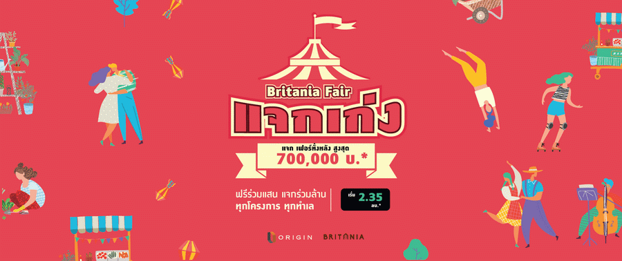 Britania Fair แจกเก่ง ฟรีร่วมแสน แจกร่วมล้าน ฟรีค่าส่วนกลางสูงสุด 5 ปี* แจก B-Package มูลค่าสูงสุด 500,000 บาท* แจก เฟอร์ทั้งหลัง สูงสุด 700,000 บาท* เริ่ม 2.35 ลบ.*