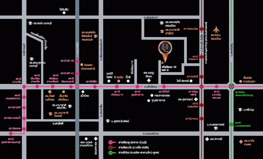 โครงการล้อมรอบด้วยสถานที่สำคัญอย่าง ไปรษณีย์ไทย (สำนักงานใหญ่), ศูนย์ราชการแจ้งวัฒนะ, บริษัท กสท โทรคมนาคม จำกัด (มหาชน), กรมการกงศุล, เซ็นทรัลพลาซา แจ้งวัฒนะ, ดิ อเวนิว แจ้งวัฒนะ, อิมแพ็ค เมืองทองธานี, โรงพยาบาลมงกุฎวัฒนะ, โรงพยาบาลเวิลด์เมดิคอล, โรงพยาบาลจุฬาภรณ์, โรงพยาบาลวิภาวดี, โรงเรียนนานาชาติฮาร์โรว์กรุงเทพ, โรงเรียนนานาชาติไอเอสบี, โรงเรียนพระหฤทัยดอนเมือง, มหาวิทยาลัยเกษตรศาสตร์, สนามบินดอนเมือง รวมถึงในอนาคตมีรถไฟฟ้าสายสีชมพู มีนบุรี-แคราย คาดว่าจะเปิดให้บริการปี 2564 โดยสถานีที่อยู่ใกล้โครงการ คือ สถานีทีโอที ซึ่งอยู่ห่างจากโครงการเพียง 250 เมตร