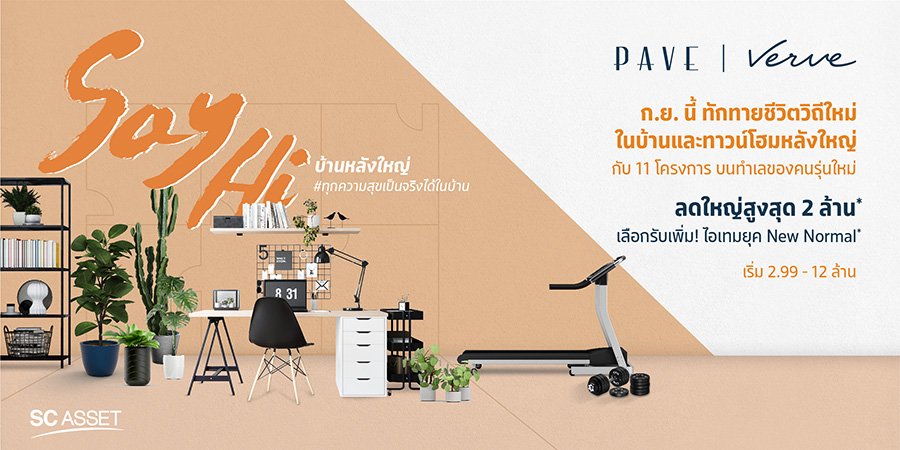 SC ASSET จัดแคมเปญพิเศษ "Say Hi บ้านหลังใหญ่" ตลอดเดือนกันยายน ให้คุณได้ทักทายชีวิตวิถีใหม่ในบ้านและทาวน์โฮมหลังใหญ่ 'PAVE' และ 'VERVE' รวมกว่า 11 โครงการ บนทำเลของคนรุ่นใหม่ ประกอบด้วย บางนา, ปิ่นเกล้า-ศาลายา, ประชาอุทิศ 90, รังสิต, มอเตอร์เวย์-ฉะเชิงเทรา, บ้านโพธิ์-ฉะเชิงเทรา, พระราม 5, เพชรเกษม 81 และพระราม 9 ในราคาเริ่ม 2.99-12 ล้าน