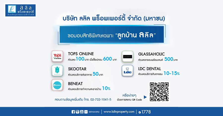 สอบถามและชมข้อมูลเพิ่มเติมของ ลลิล พร็อพเพอร์ตี้ ได้ที่ Call Center 1778 หรือ www.lalinproperty.com