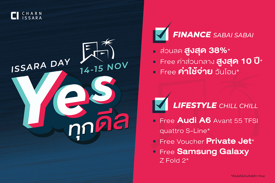 เข้าสู่ไตรมาสสุดท้ายของปี แม้จะเจอสถานการณ์การแพร่ระบาดของไวรัสโควิด-19 เข้ามากระทบภาคธุรกิจ แต่ชาญอิสสระ ก็ยังเดินหน้าพัฒนาธุรกิจเพื่อสร้างความสุขในการอยู่อาศัยให้กับลูกค้าอย่างต่อเนื่อง ล่าสุดผู้บริหารหนุ่ม "ปลาทู-ดิฐวัฒน์ อิสสระ" ออกแคมเปญใหญ่สร้างสีสันกระตุ้นตลาดอสังหาฯ ปลายปีกับ "ISSARA DAY YES ทุกดีล" ให้ลูกค้าได้เลือกข้อเสนอที่ใช่ ตามใจคุณ กับ 9 โครงการคุณภาพทั้งในกรุงเทพและต่างจังหวัด กับข้อเสนอ Finance Sabai Sabai ด้วยการมอบส่วนลดสูงสุดถึง 38%, ฟรีค่าส่วนกลางสูงสุด 10 ปี, ฟรีค่าใช้จ่ายวันโอน, ฟรีอยู่ฟรี 1 ปี หรือลูกค้าสามารถเลือกข้อเสนอ Lifestyle Chill Chill เลือกรับรถยนต์ Audi A6 Avant 55 TFSI quattro S-Line, ฟรีบัตรกำนัลไพรเวทเจ็ท มูลค่าสูงสุด 1 ล้านบาท, ฟรีมือถือ Samsung Galaxy Z Fold 2, ฟรีบัตรกำนัลเฟอร์นิเจอร์ Chanintr Living มูลค่าสูงสุด 3 ล้านบาท นอกจากนี้ลูกค้าที่ลงทะเบียนออนไลน์ยังจะได้รับส่วนลดสูงสุด 200,000 บาท ตั้งแต่วันนี้ - 15 พ.ย. 63