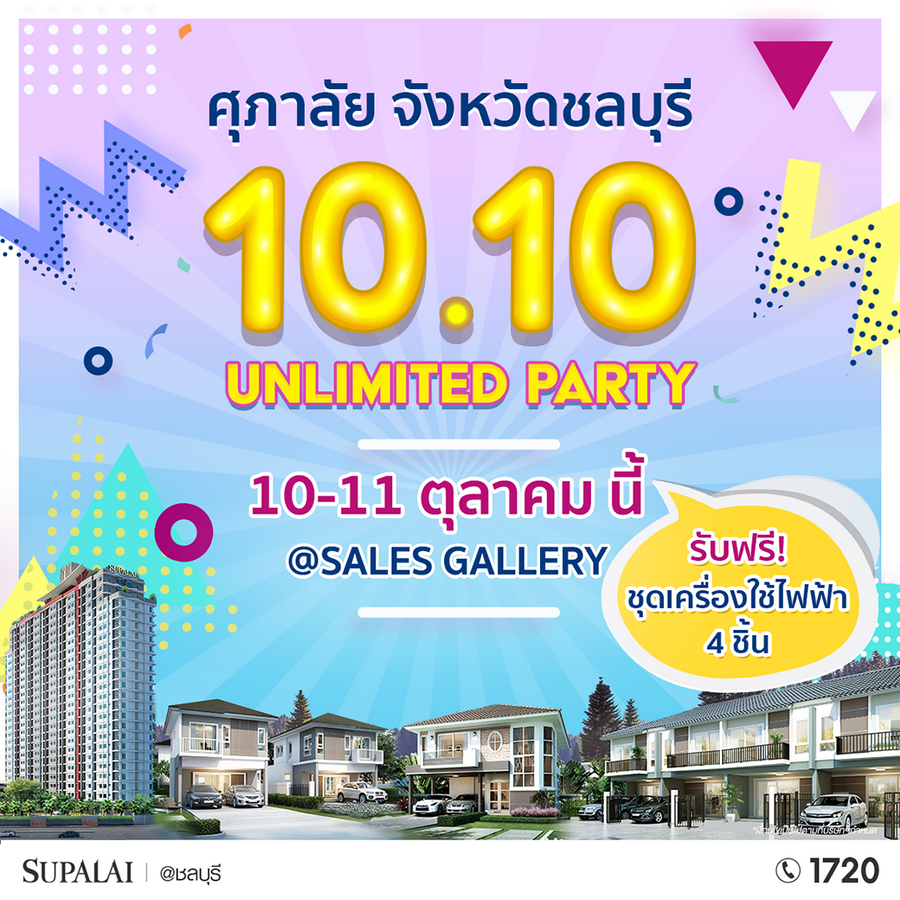 10 - 11 ตุลาคม 2563 นี้ พบกับงาน "SUPALAI 10.10 UNLIMITED PARTY" 10 โครงการ จังหวัด ชลบุรี จองวันนี้!! รับเพิ่ม ชุดเครื่องใช้ไฟฟ้า Samsung 4 ชิ้น พร้อมกับโปรโมชั่นดีๆ บ้านและคอนโดโครงการจังหวัดชลบุรี ลดไฟลุก รับไฟแล่บ.. รับลดก่อนสิ้นปี
