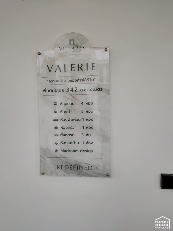 2. Valerie (Type A): จำนวน 18 ยูนิต พื้นที่ใช้สอยเริ่มต้น 97.8 ตารางวา 342 ตารางเมตร ขนาด 4 ห้องนอน 5 ห้องน้ำ 1 ห้องพักผ่อน 1 ห้องครัว 1 ห้องแม่บ้าน ที่จอดรถ 3 คัน