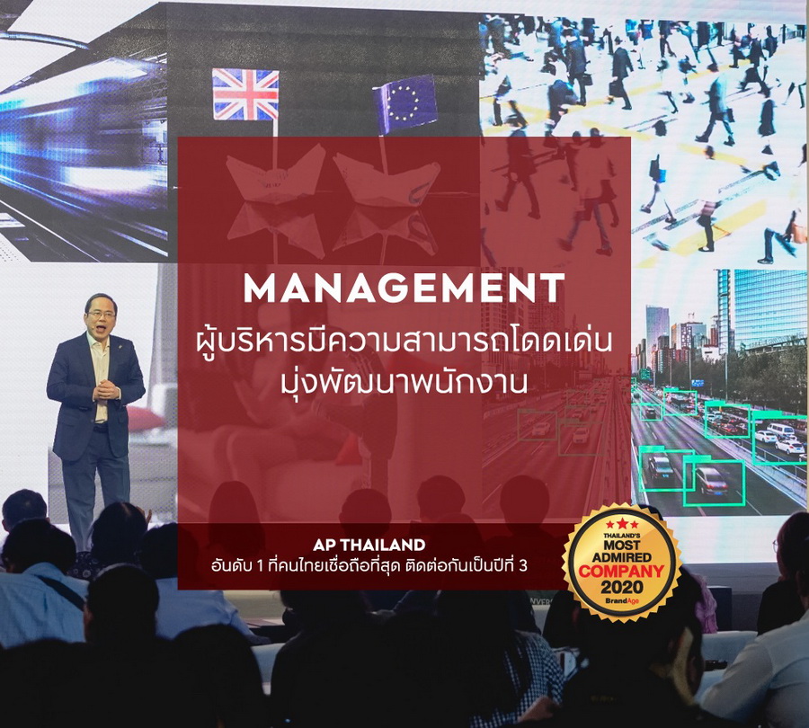 นายวิทการ จันทวิมล ผู้อำนวยการสายงานกลยุทธ์องค์กร และการสร้างสรรค์ บมจ. เอพี (ไทยแลนด์) กล่าวว่า "ครั้งนี้ถือเป็นปีที่ 3 ที่ทางเอพีได้รับรางวัลอันดับ 1 บริษัทยอดนิยมกลุ่มอสังหาริมทรัพย์ : Thailand?s Most Admired Company 2020 ติดต่อกันตั้งแต่ปี 2018-2020 โดยทีมวิจัยแบรนด์เอจ ซึ่งสะท้อนได้ถึงความแข็งแกร่งขององค์กรผ่านสายตาของผู้บริโภค ตลอดจนการรักษามาตรฐานในการดำเนินงาน ที่ถึงแม้ในปีนี้จะต้องเผชิญกับสภาวะความผันผวนและความท้าทายจากปัจจัยภายนอกที่มากมายก็ตาม ซึ่งเชื่อว่าคีย์สำคัญที่ต่อยอดให้เอพีแข็งแกร่งและสามารถรักษามาตรฐานได้ดีจนถึงวันนี้คือ พนักงานกว่า 2,000 คนมองไปที่เป้าหมายเดียวกัน ภายใต้วิสัยทัศน์ EMPOWER LIVING พร้อมการขับเคลื่อนวัฒนธรรมองค์กรที่ทำให้พนักงานทุกคนเปิดรับและเรียนรู้ที่จะเข้าใจจุดประสงค์ ความต้องการและความท้าทายของทุกคนในสังคม ควบคู่ไปกับความมุ่งมั่นที่จะพัฒนากระบวนการทำงาน การพัฒนาสินค้าและบริการให้ดีขึ้นในทุกวัน"