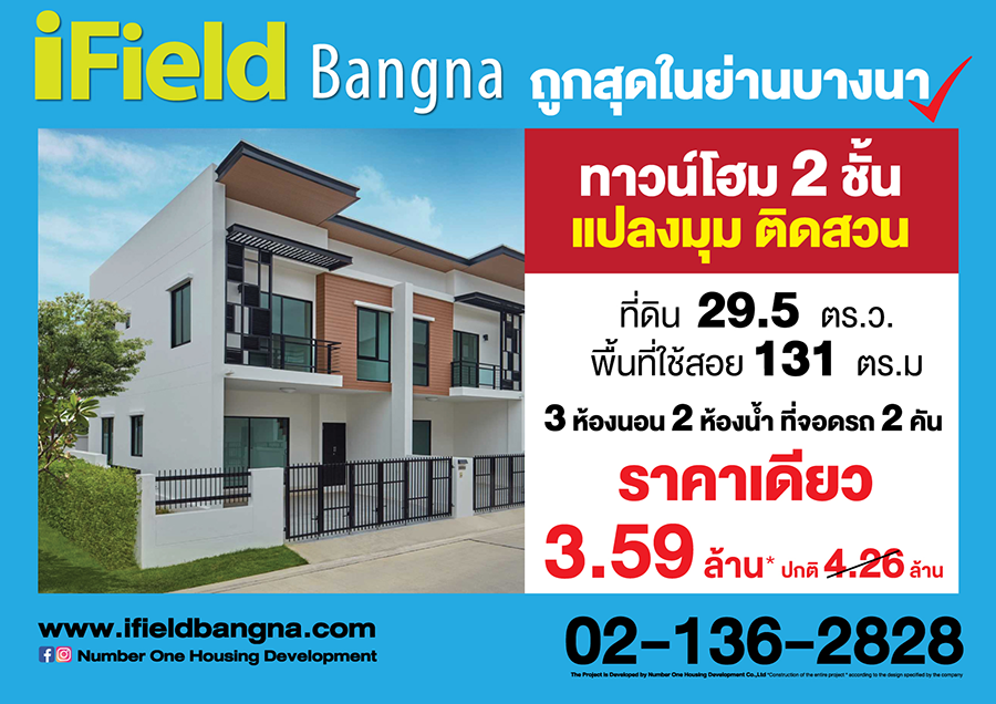 ไอฟีลบางนา เปิดจองทาวน์โฮม 2 ชั้น แปลงมุมติดสวน ที่ดินใหญ่ 29.5 ตร.ว. ราคาพิเศษเพียง 3.59 ลบ.