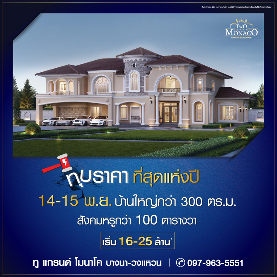 Promotion : 14-15 พ.ย.นี้ ทุบราคาแรง กับโปรที่สุดแห่งปี ห้ามพลาด บ้านใหญ่กว่า 300 ตร.ม. สังคมหรูกว่า 100 ตร.ว. 6 จอดรถ หลังใหญ่ คุ้มที่สุดในบางนา โดดเด่นอย่างมีระดับ กับ สังคมสุดหรู เริ่ม 16-25 ล้าน* บนทำเลคุณภาพ ติดถนนใหญ่ ใกล้เมกาบางนา + สุวรรณภูมิ